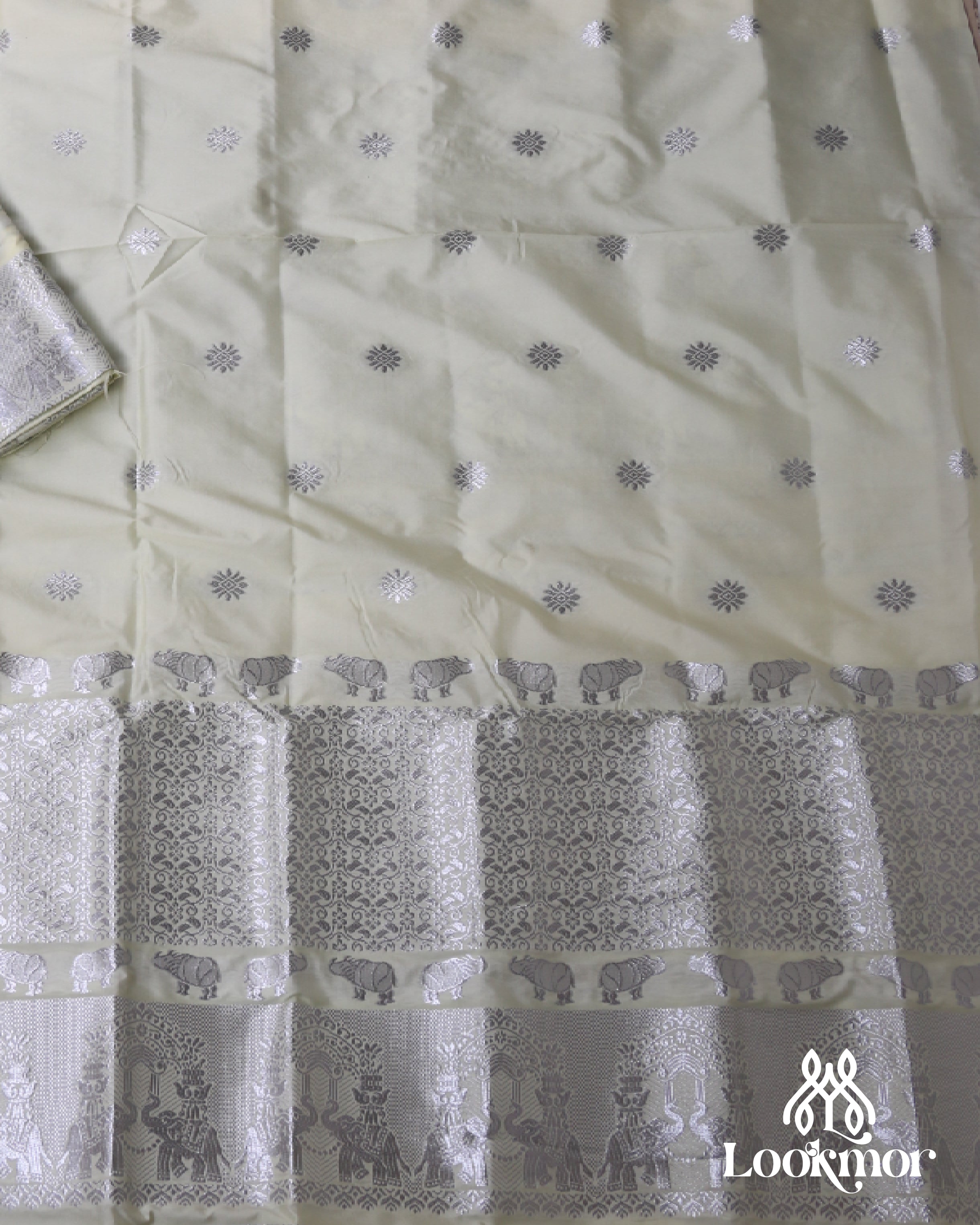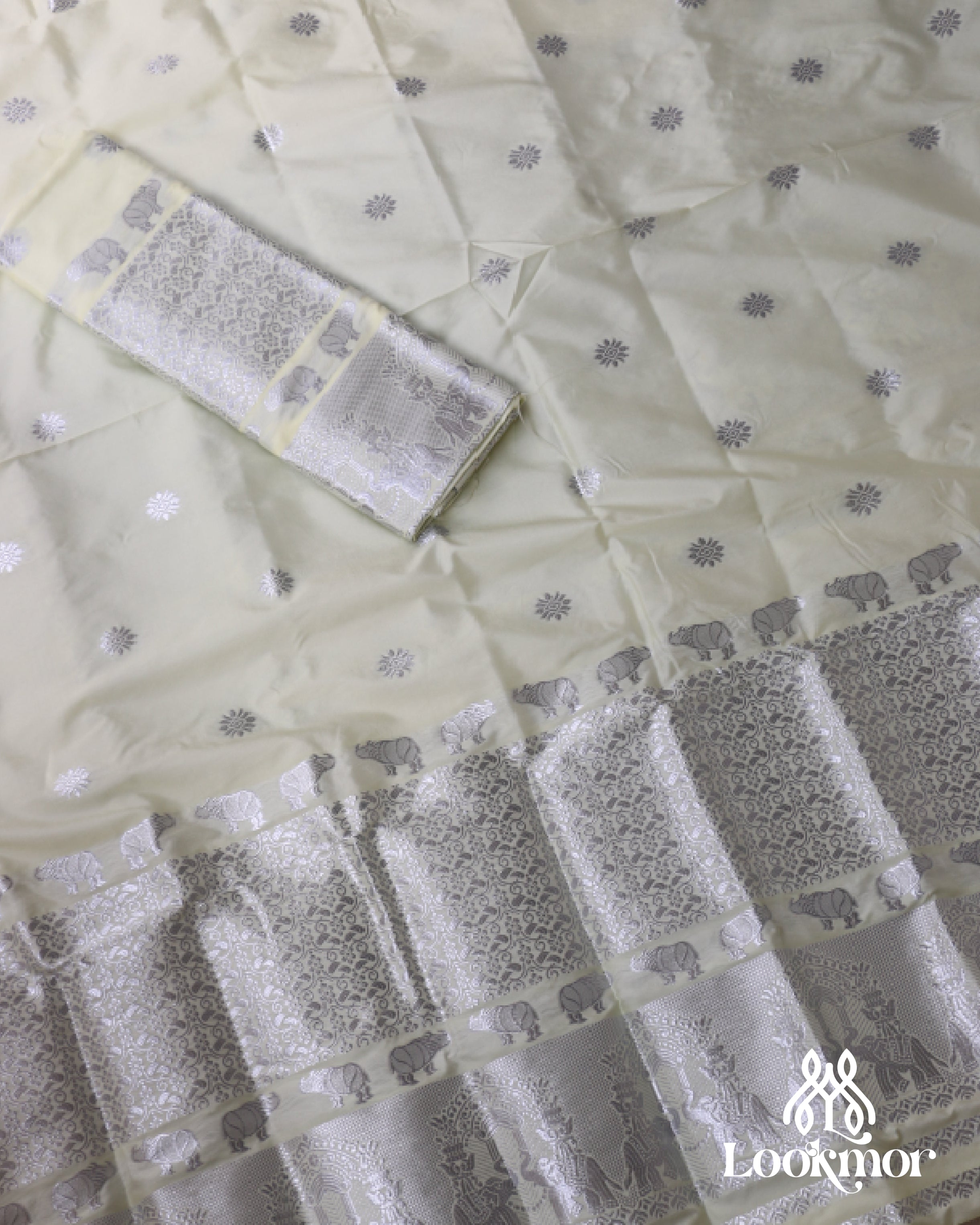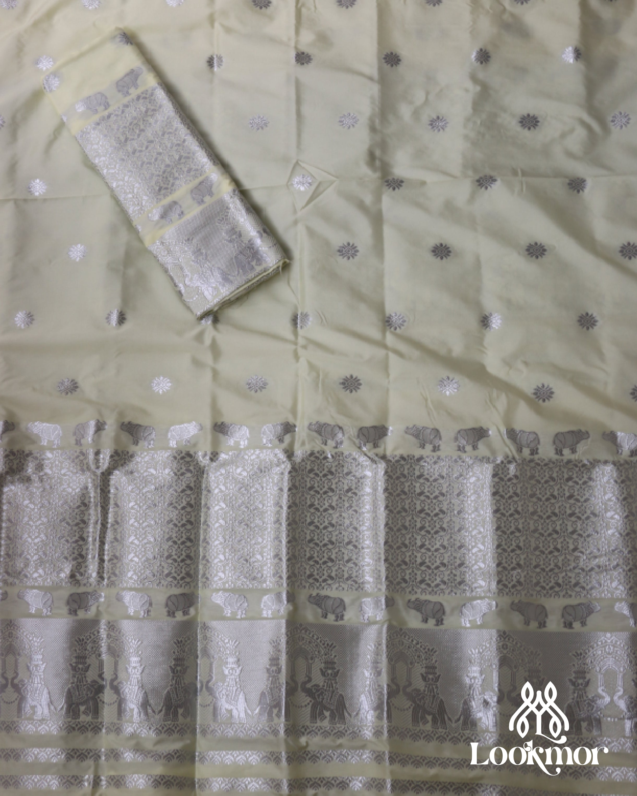 Light Yellow Silver Jari Super Semi Paat Set Mekhela Sador