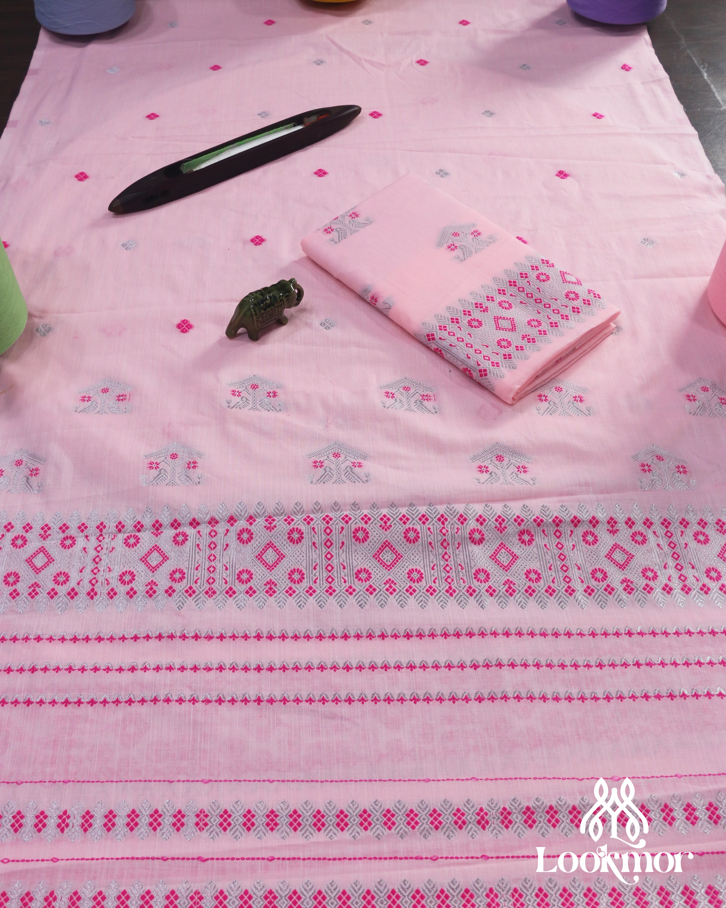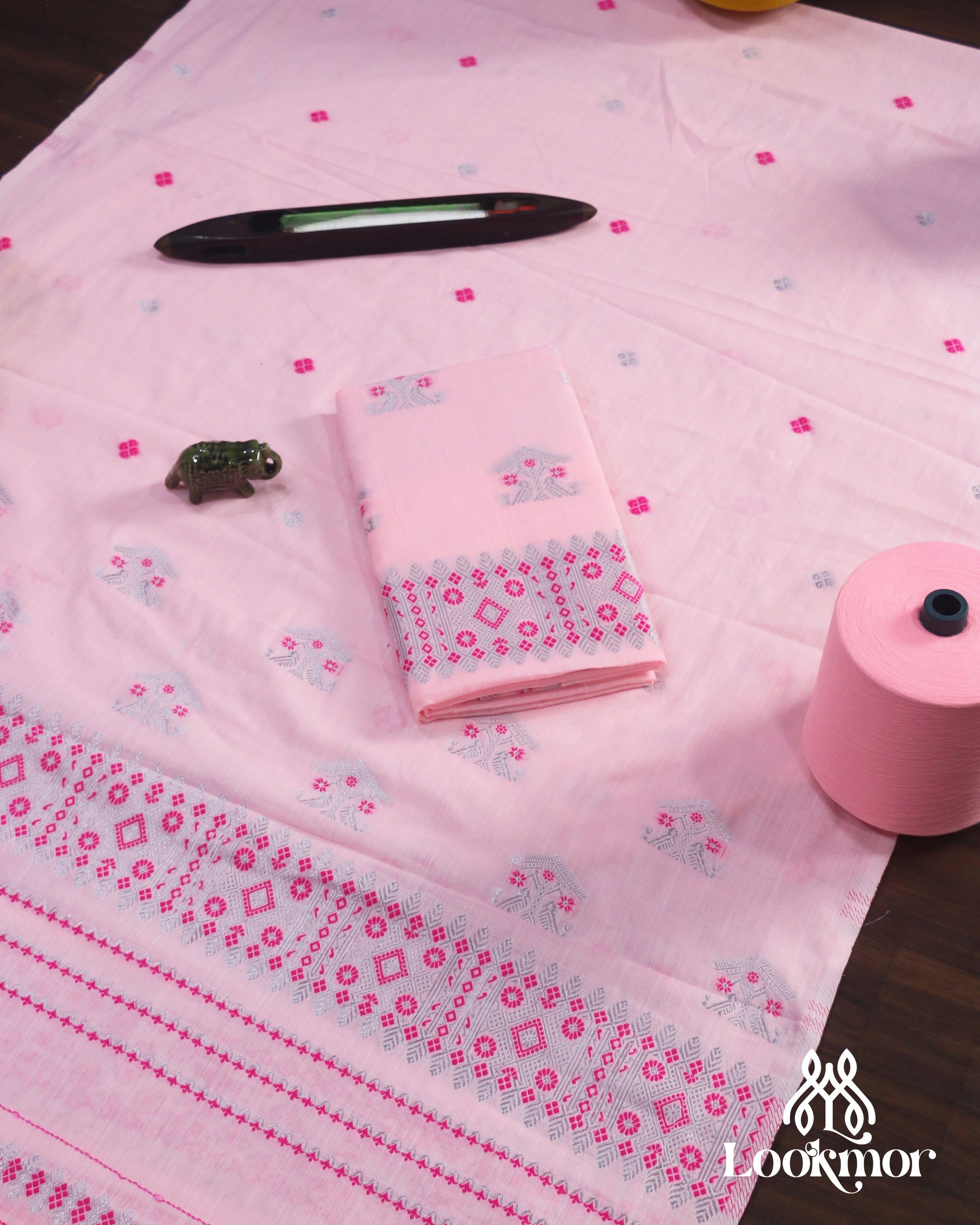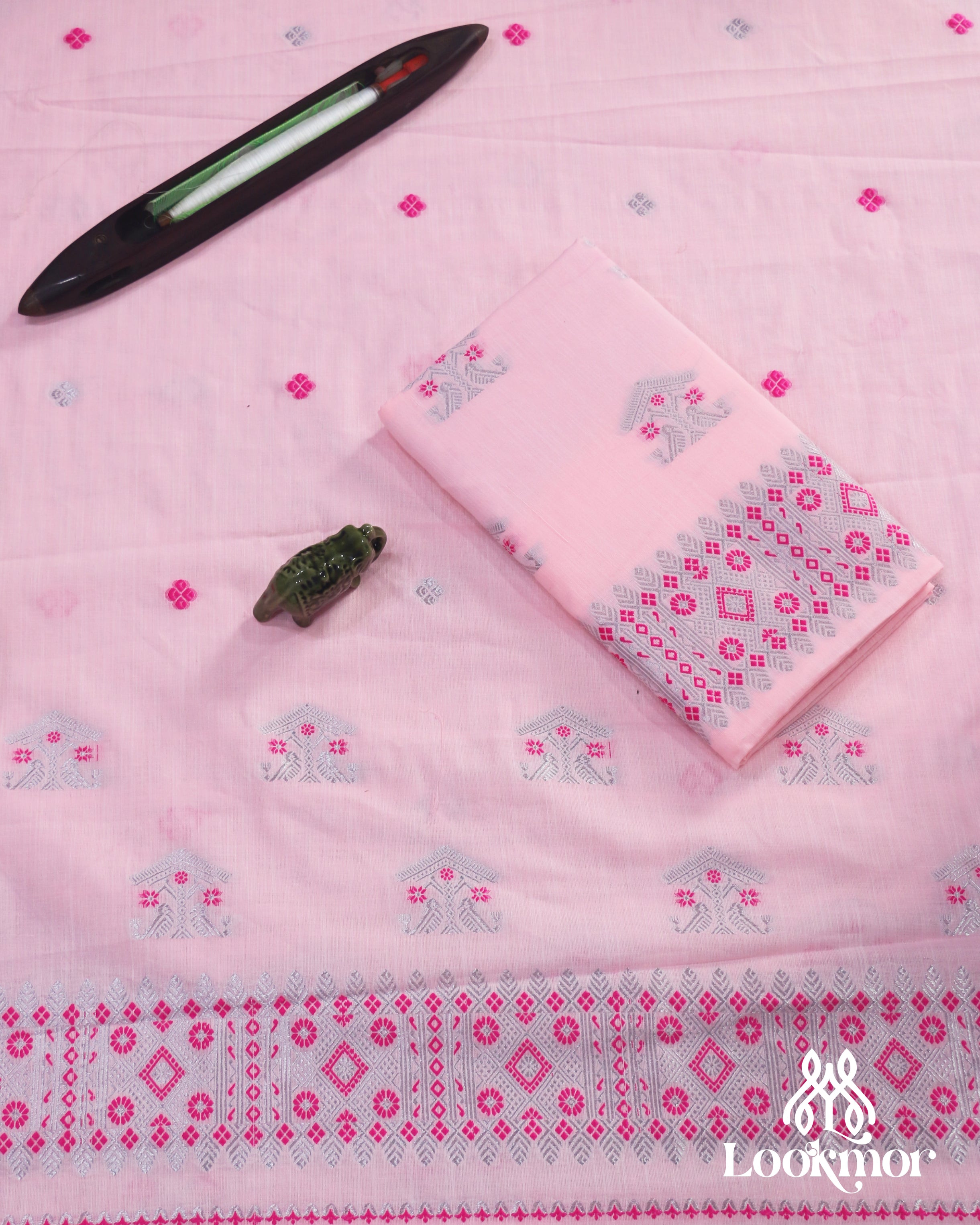 Delicate Pink Cotton Kesapaat Mekhela Sador Set in Floral Motif with Graceful Jura Pairing