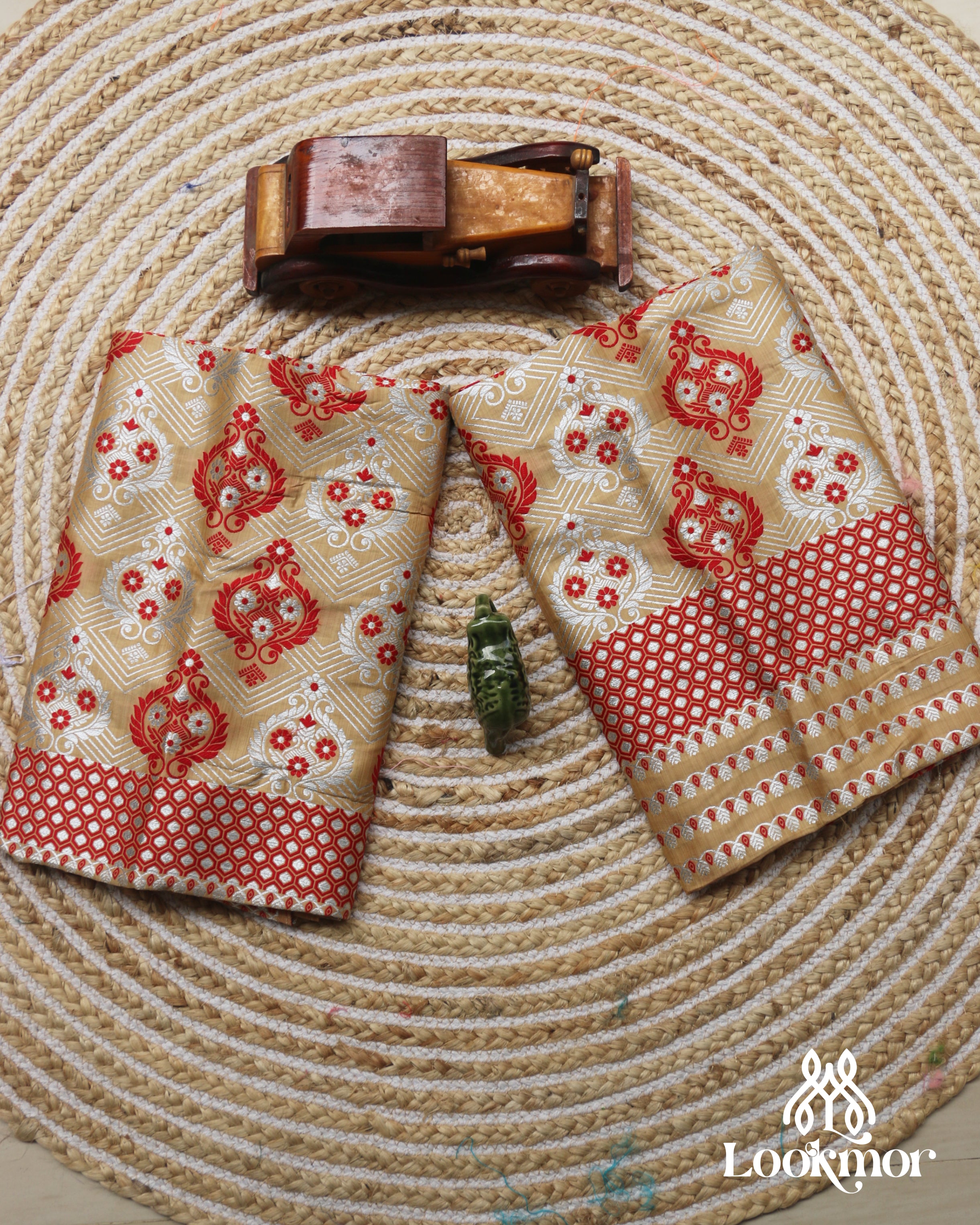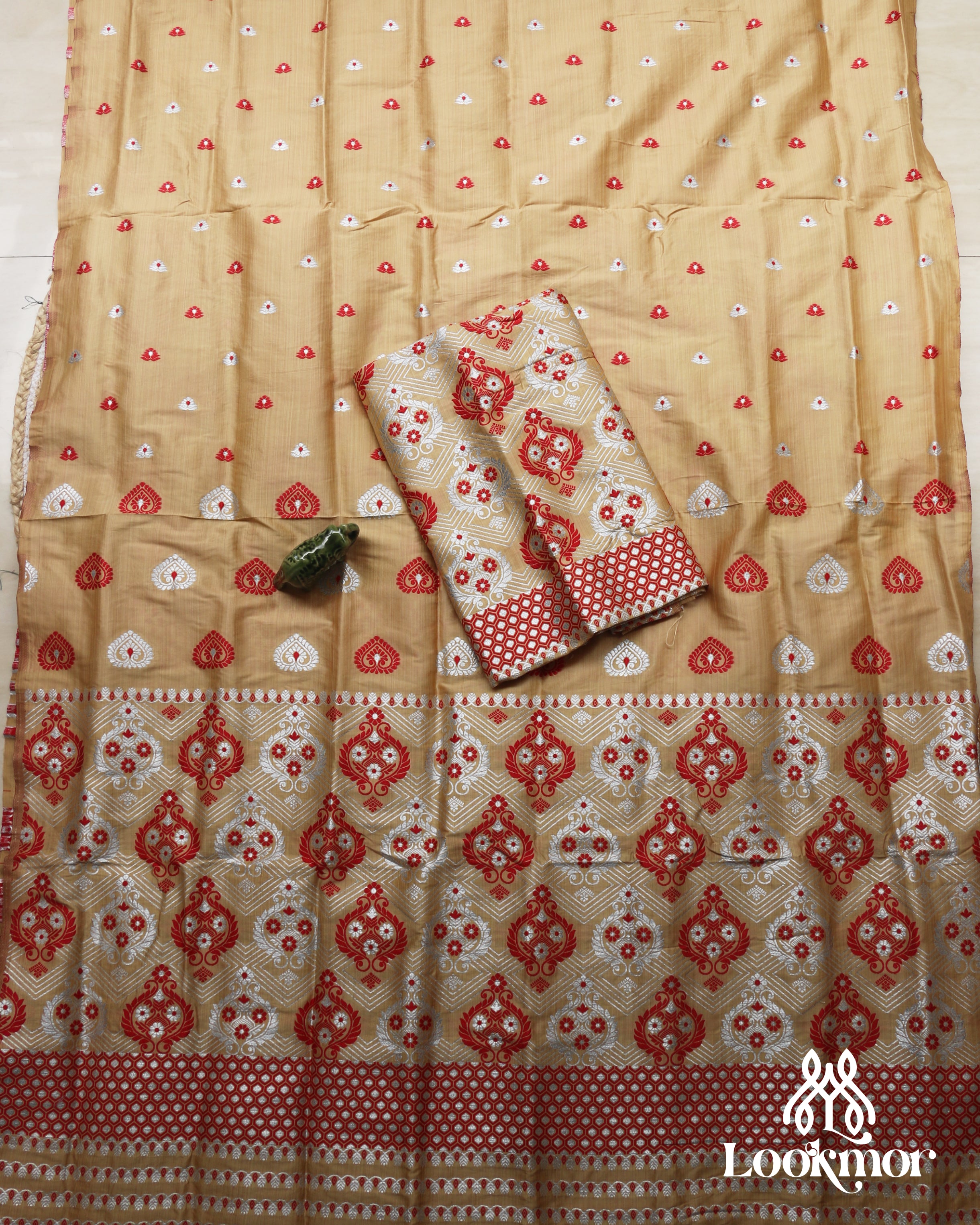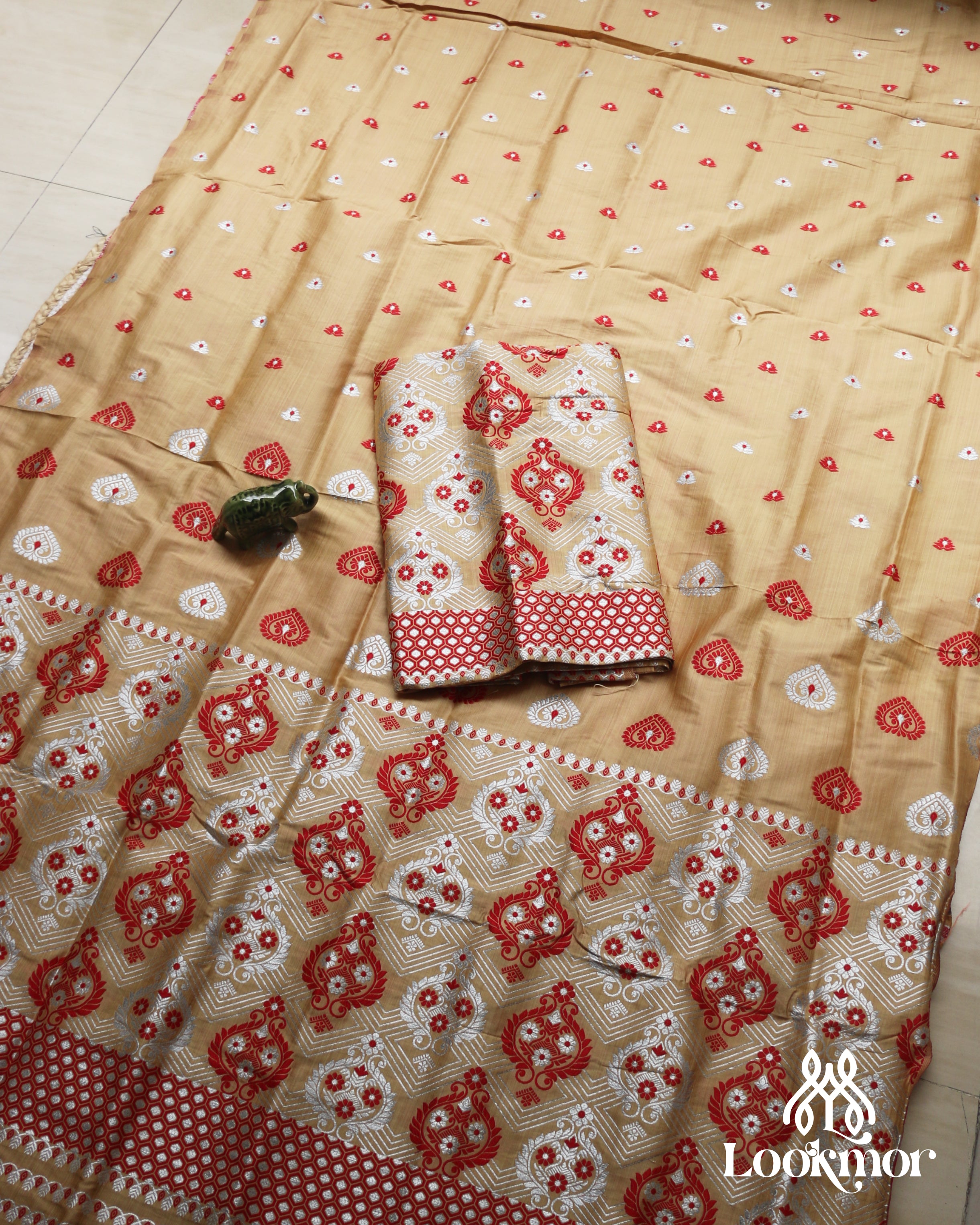 Gold Cream Traditional Assamese Mekhela Sador in Premium Mix Paat – Festive Wear