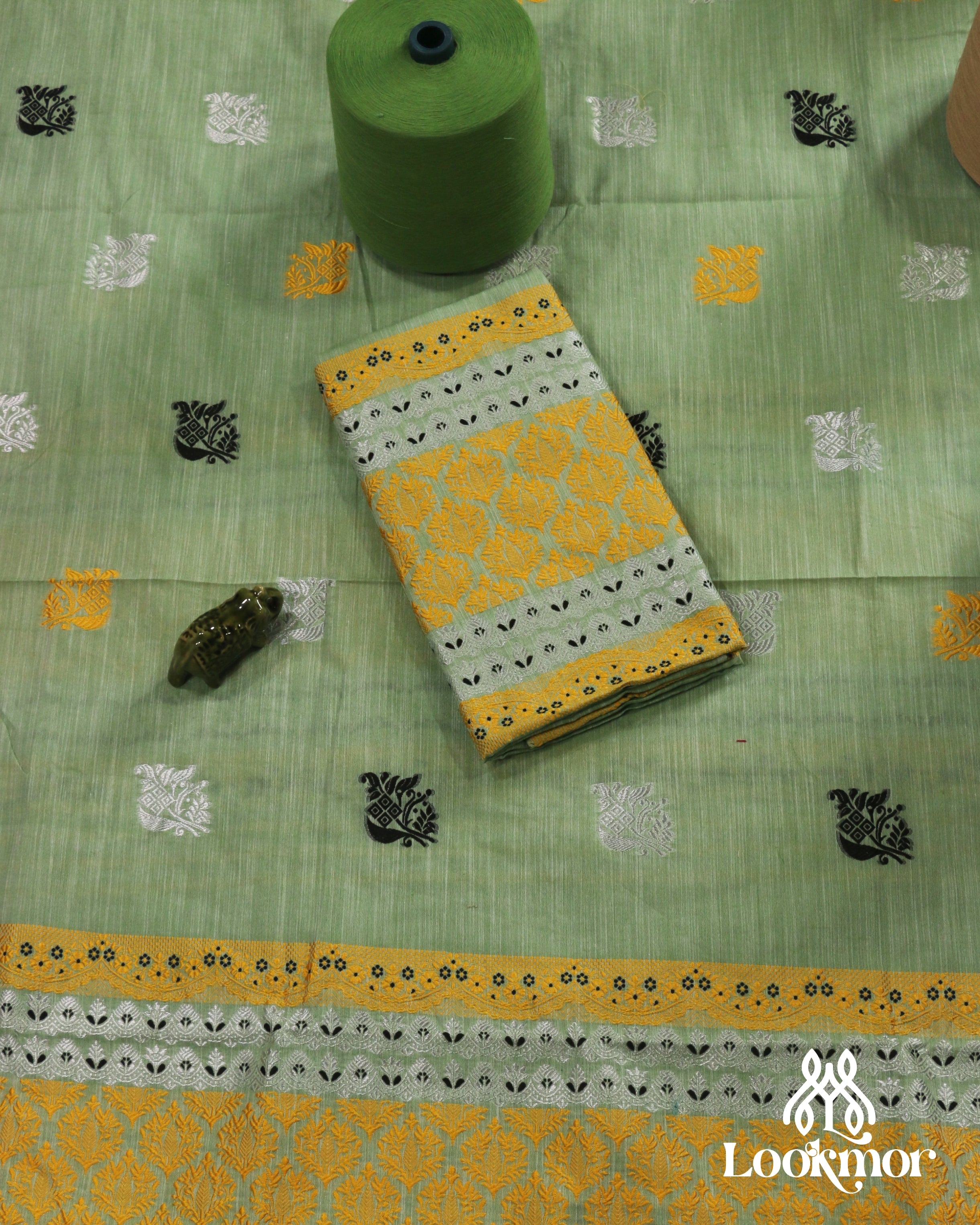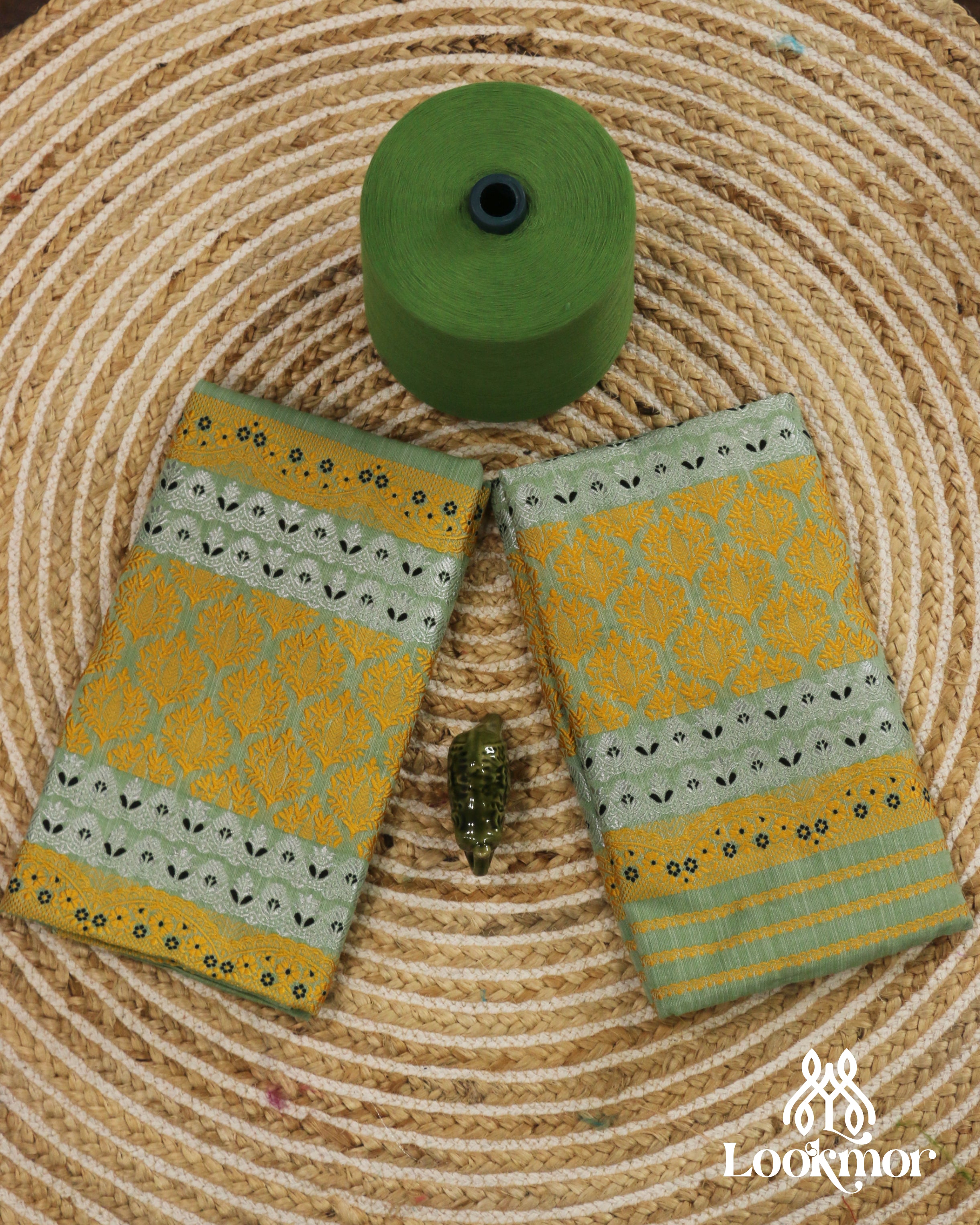 Premium Green Cotton Kesapaat Set Mekhela Sador with Jura