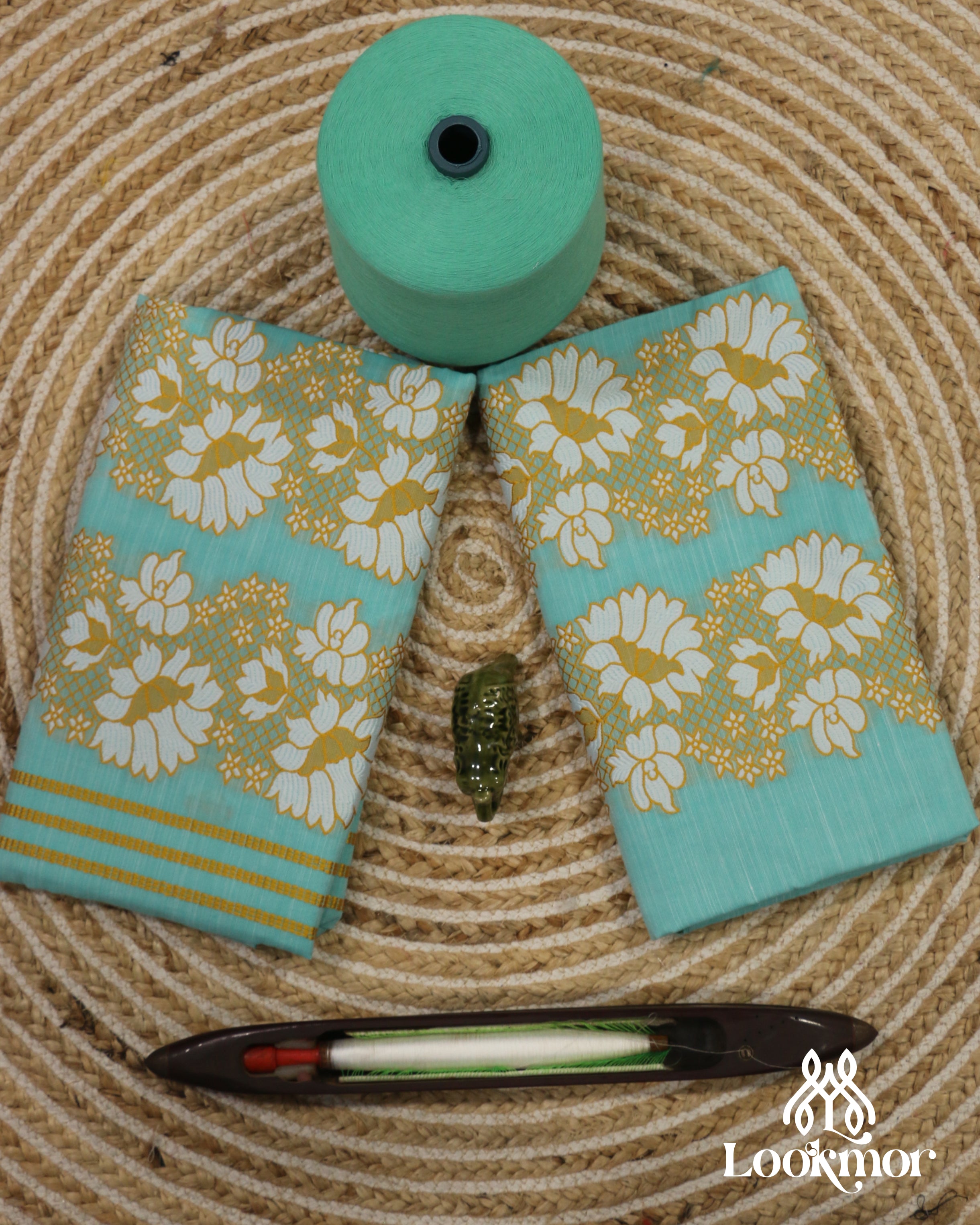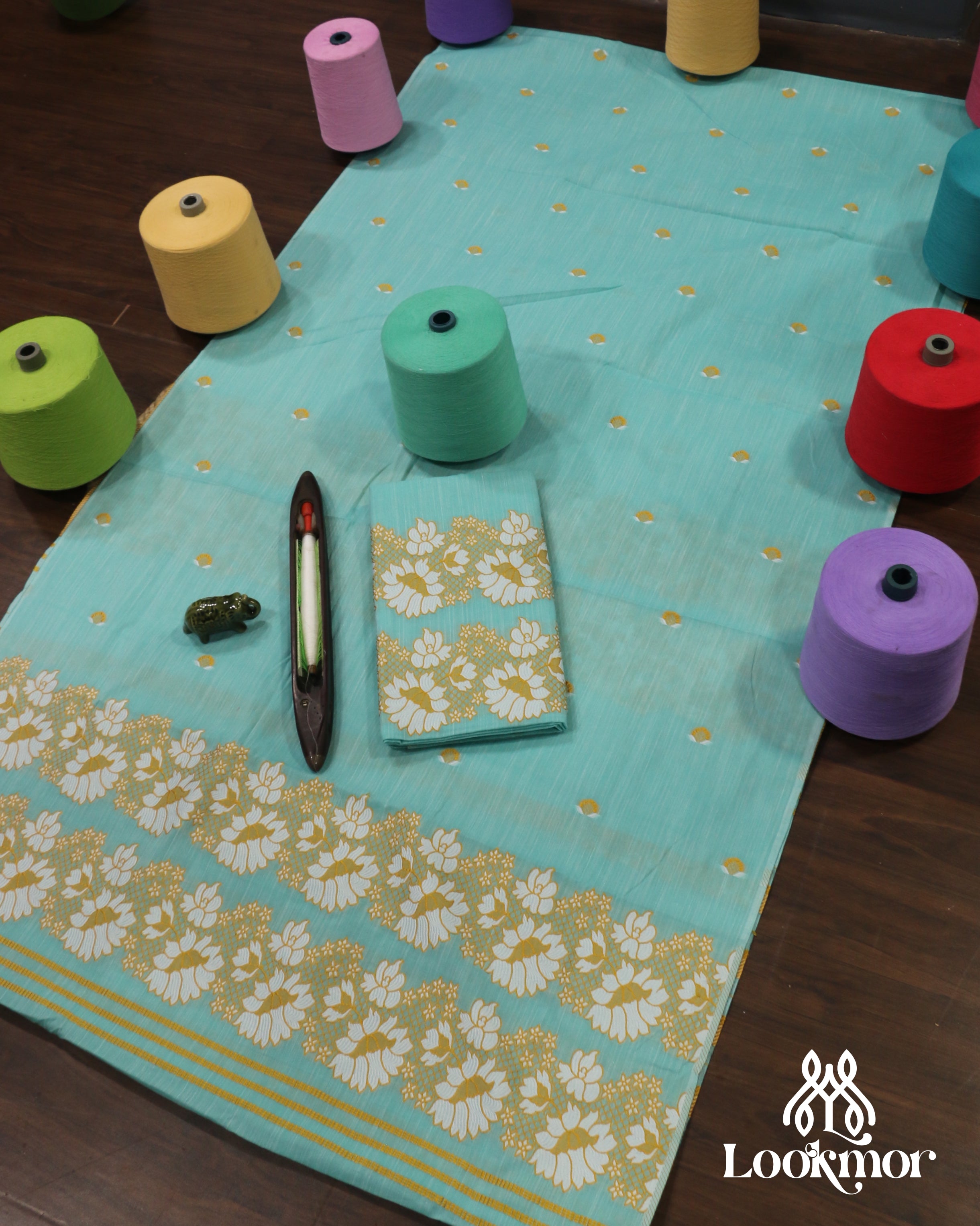Premium Cyan Cotton Kesapaat Set Mekhela Sador with Jura