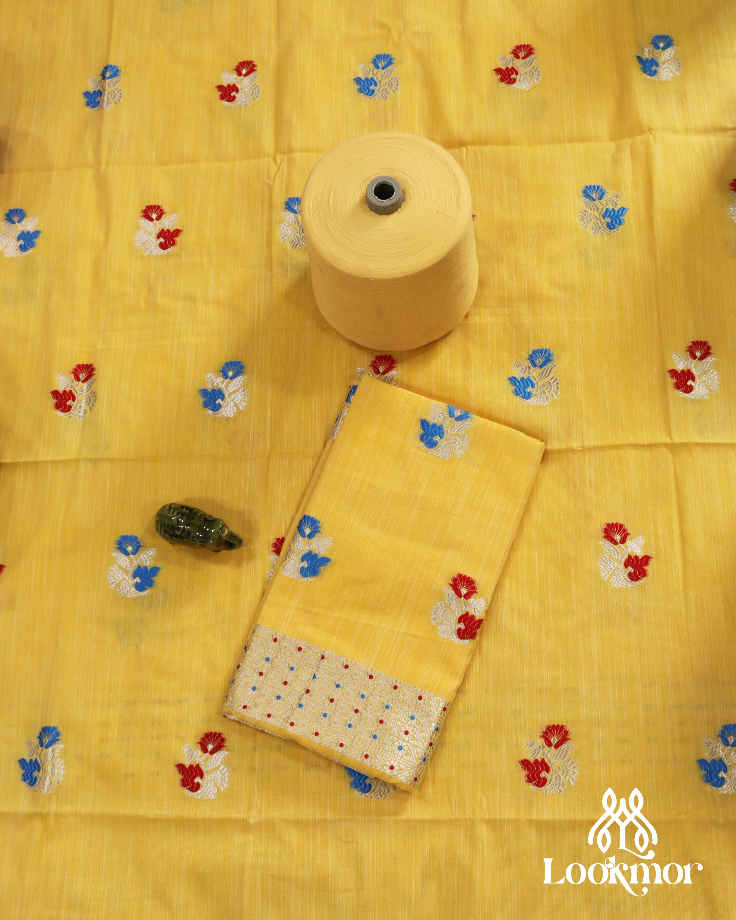 Premium Yellow Cotton Kesapaat Set Mekhela Sador with Jura