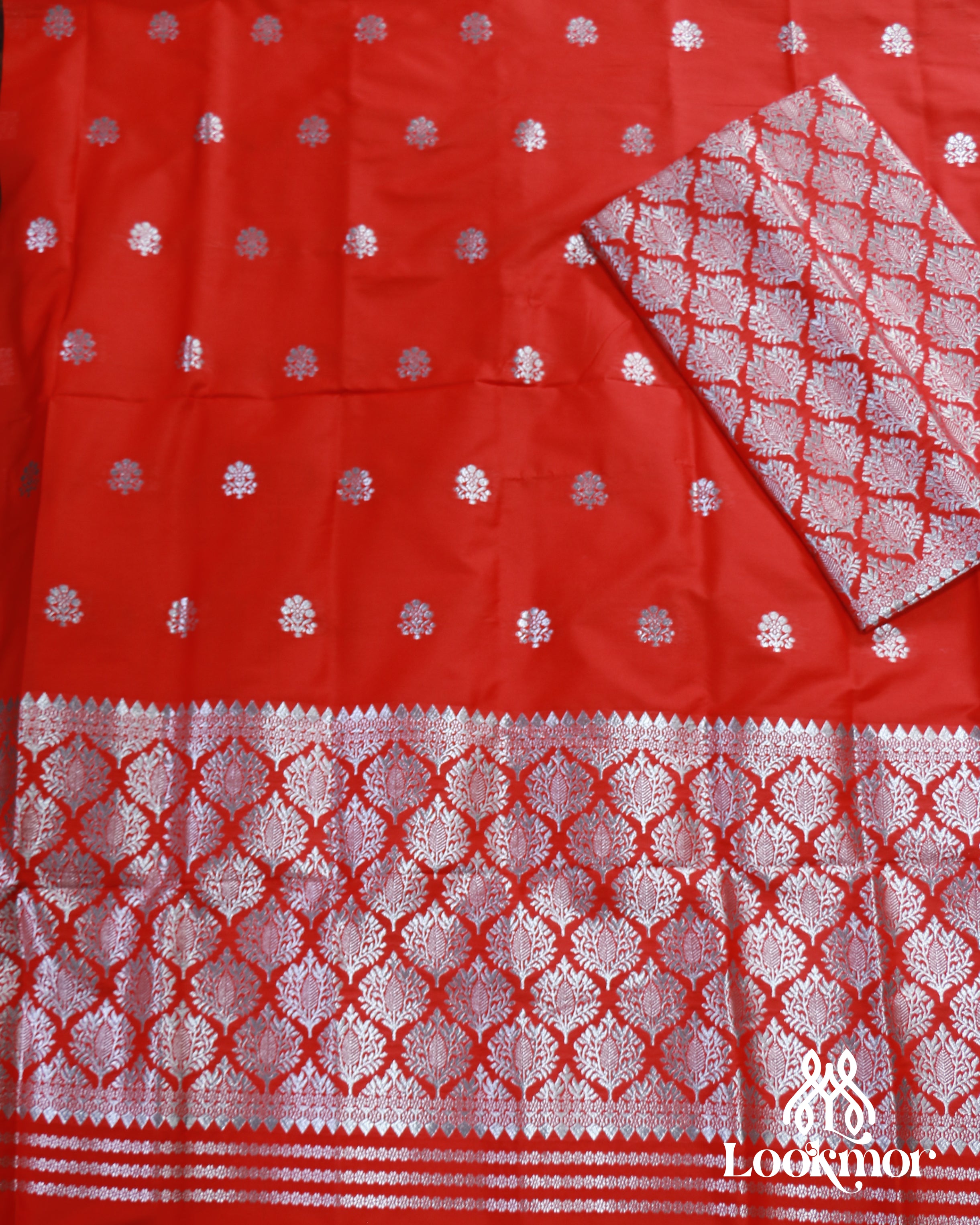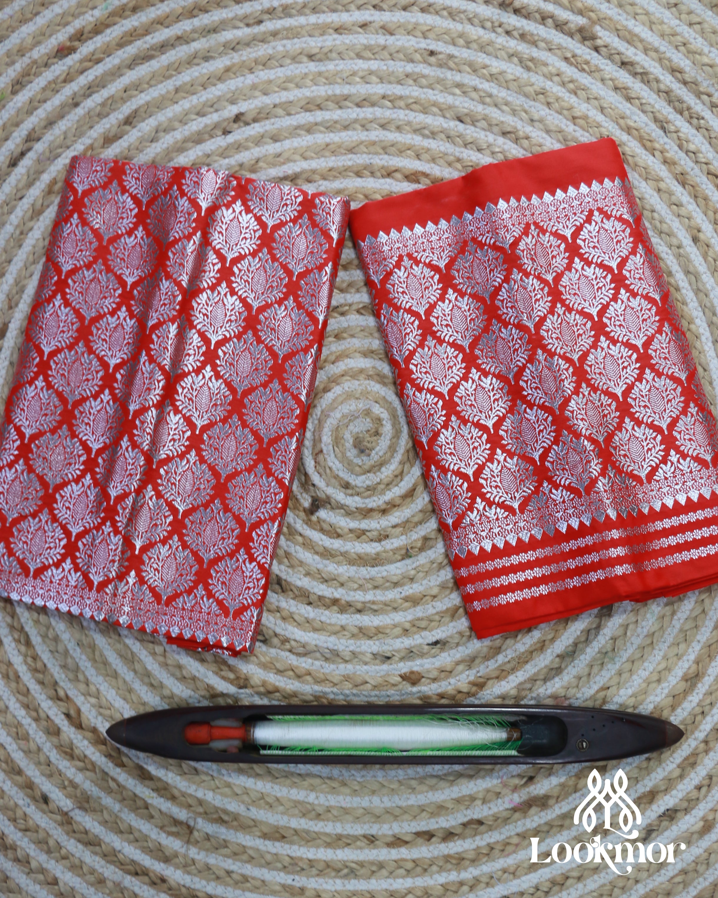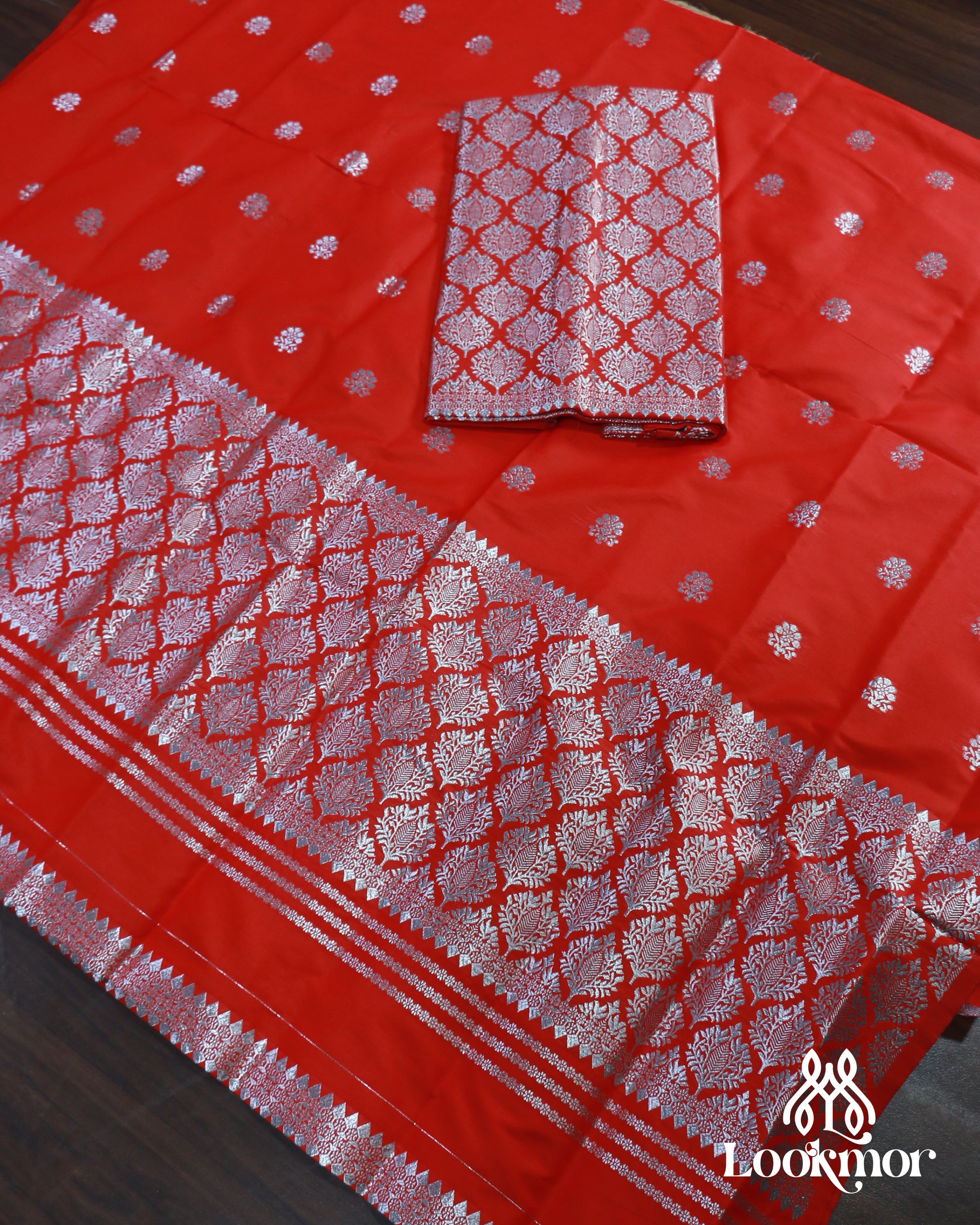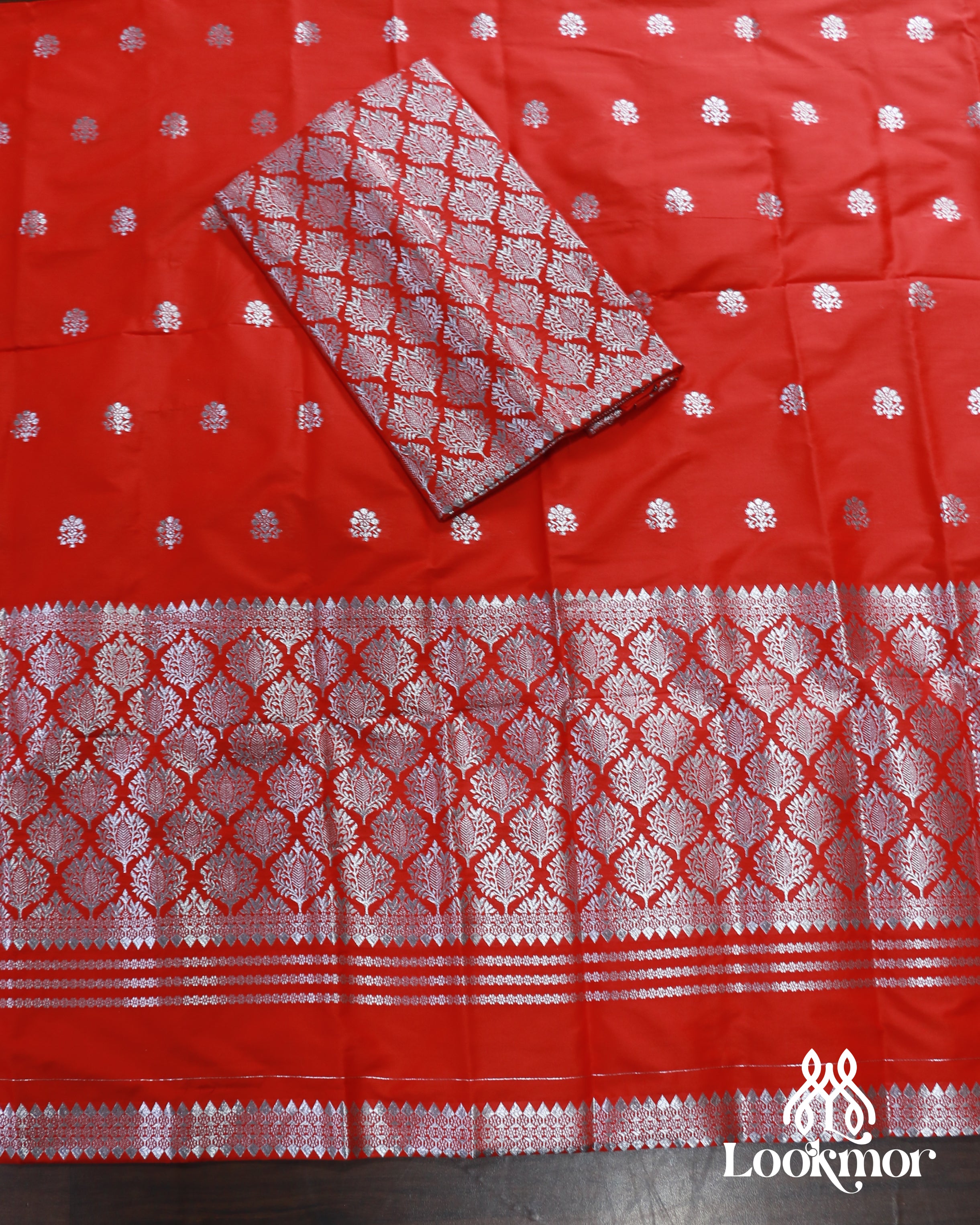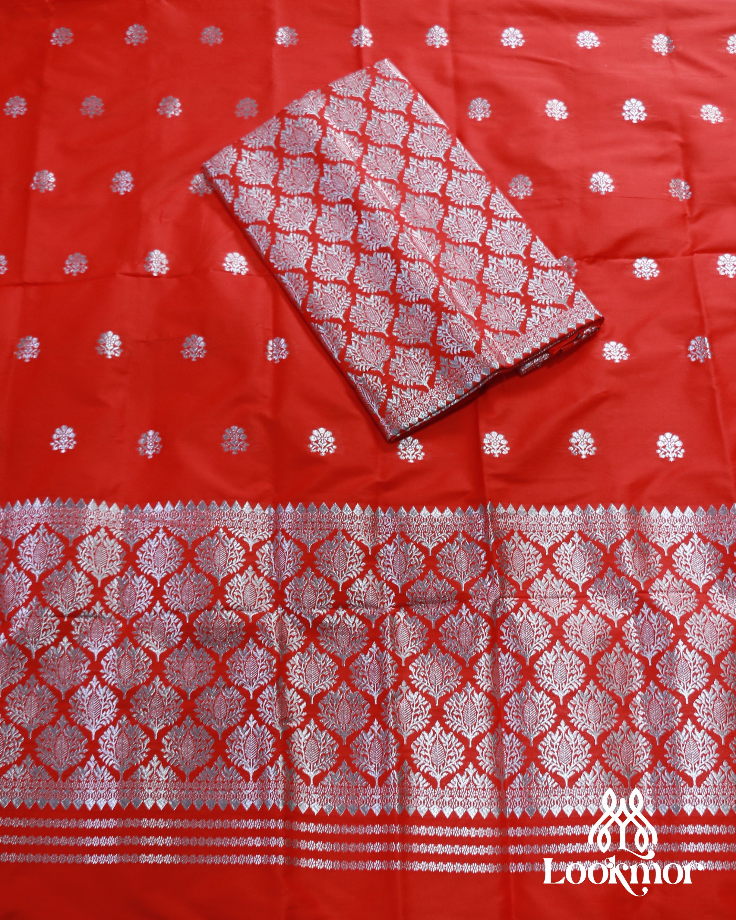 Red Semi Paat Mekhla Chador with Silver Jari – Elegant Assamese Traditional