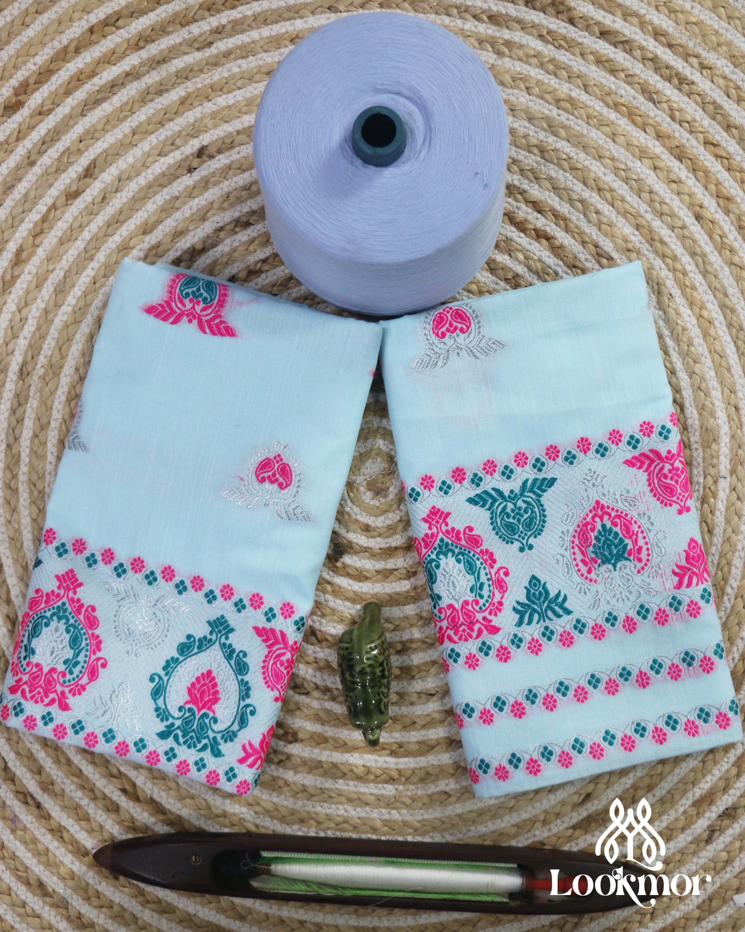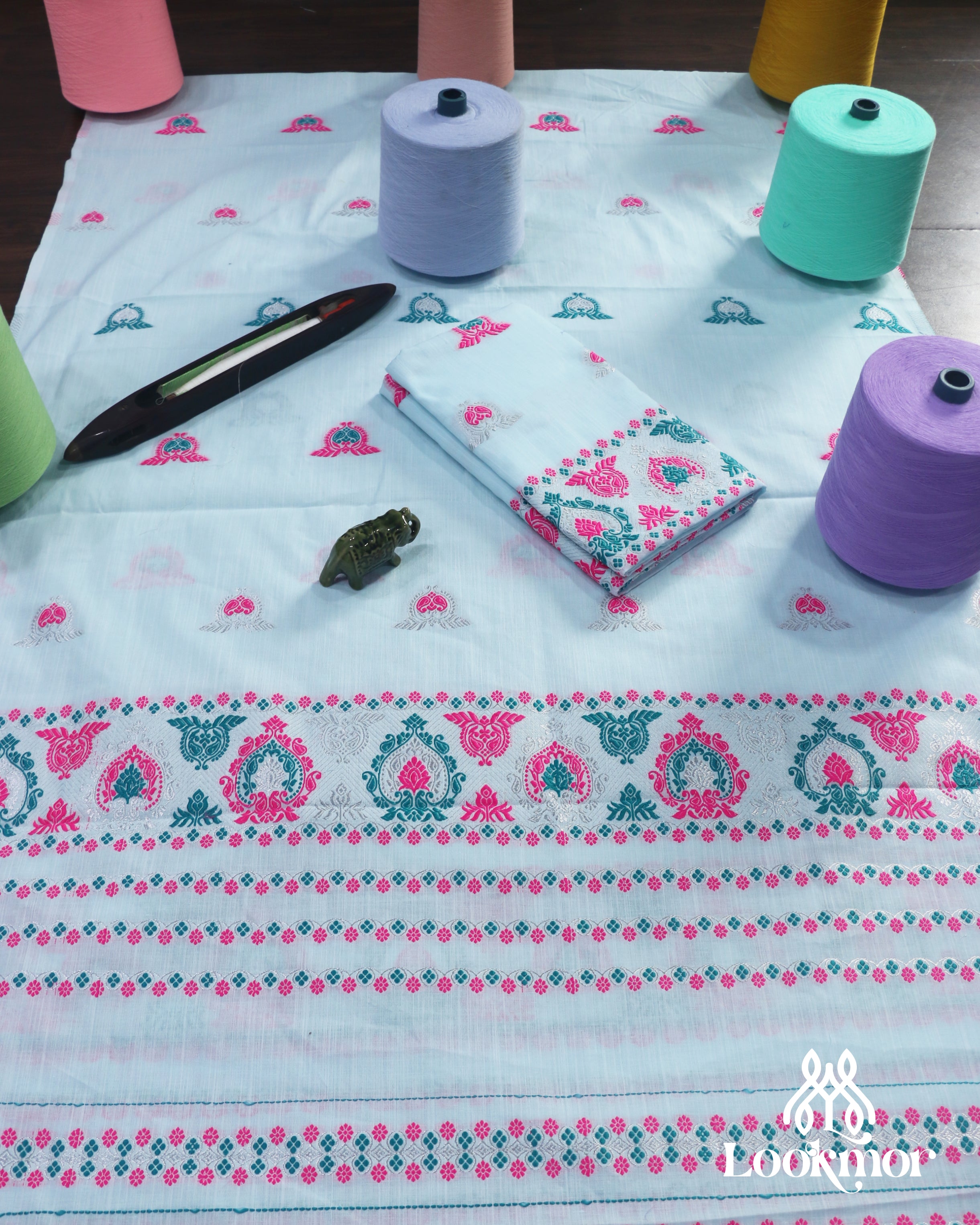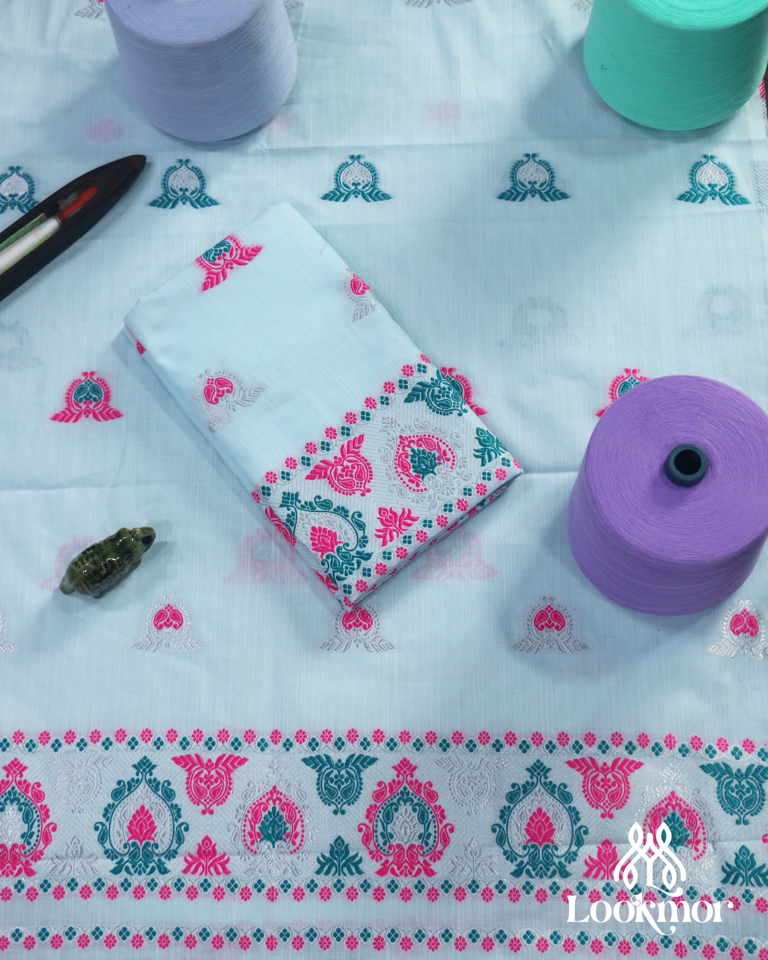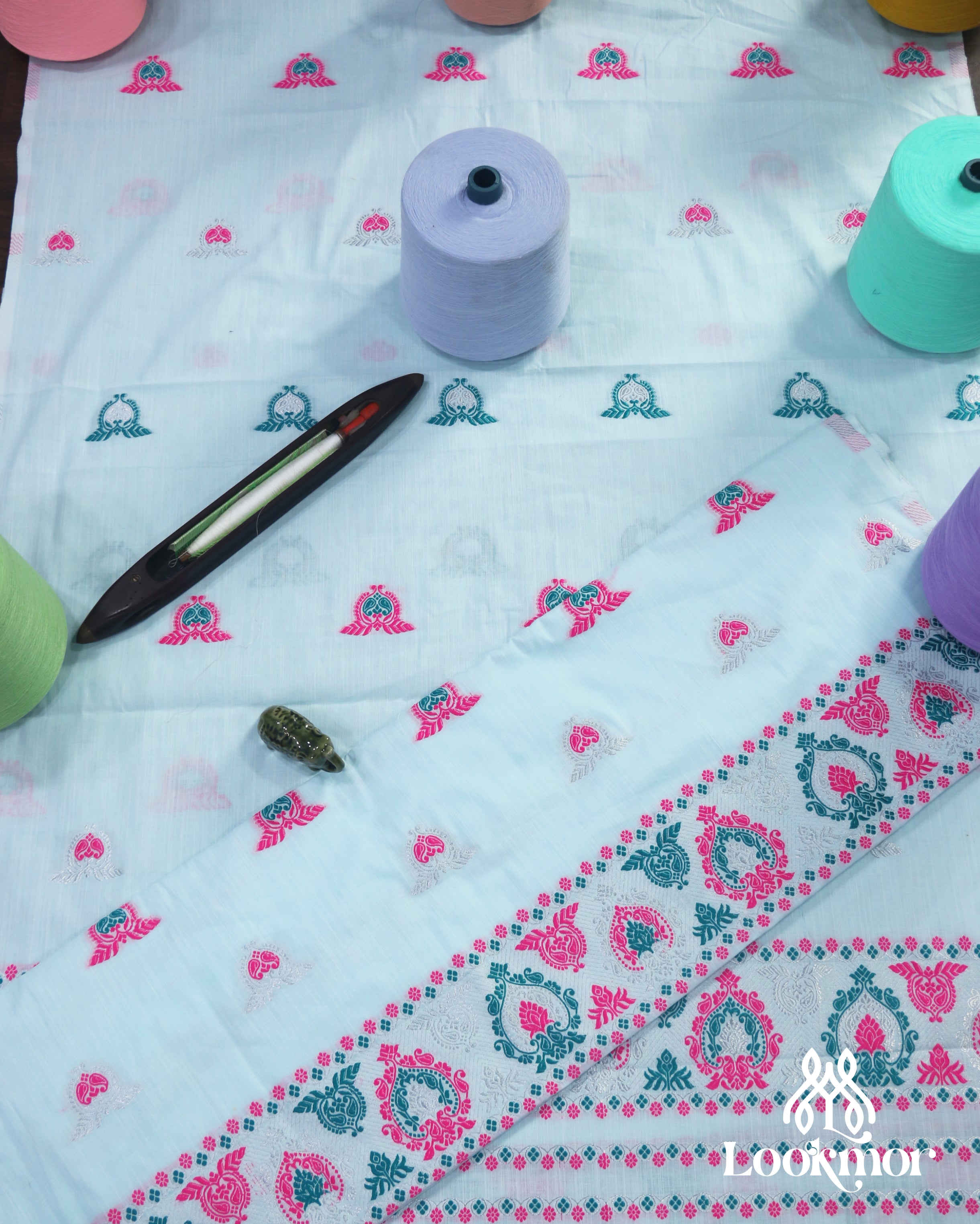 Soft Light Blue Cotton Kesapaat Mekhela Sador Set and Classic Jura