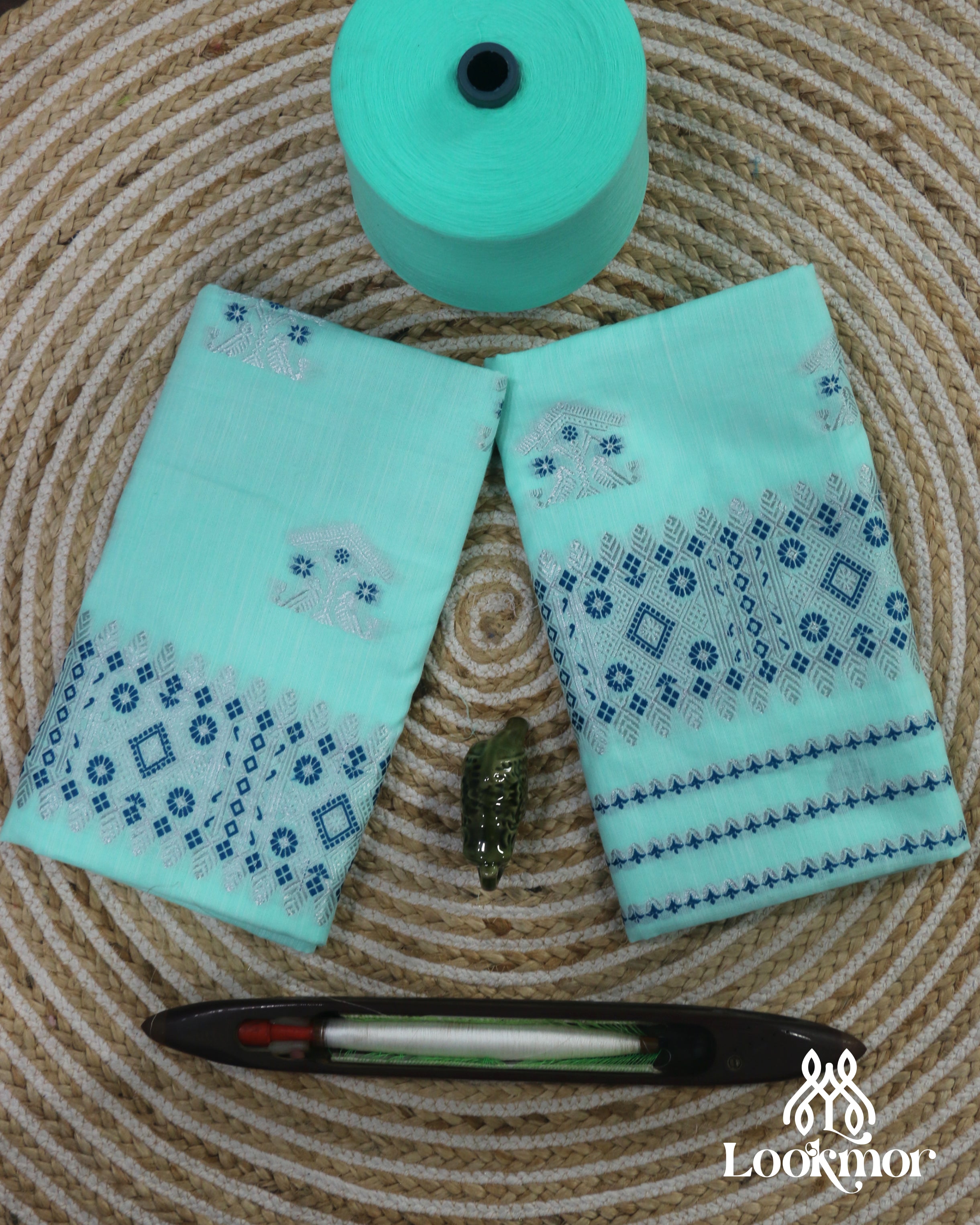 Trendy Cyan Cotton Kesapaat Set Mekhela Sador in Contemporary Weave with Matching Jura