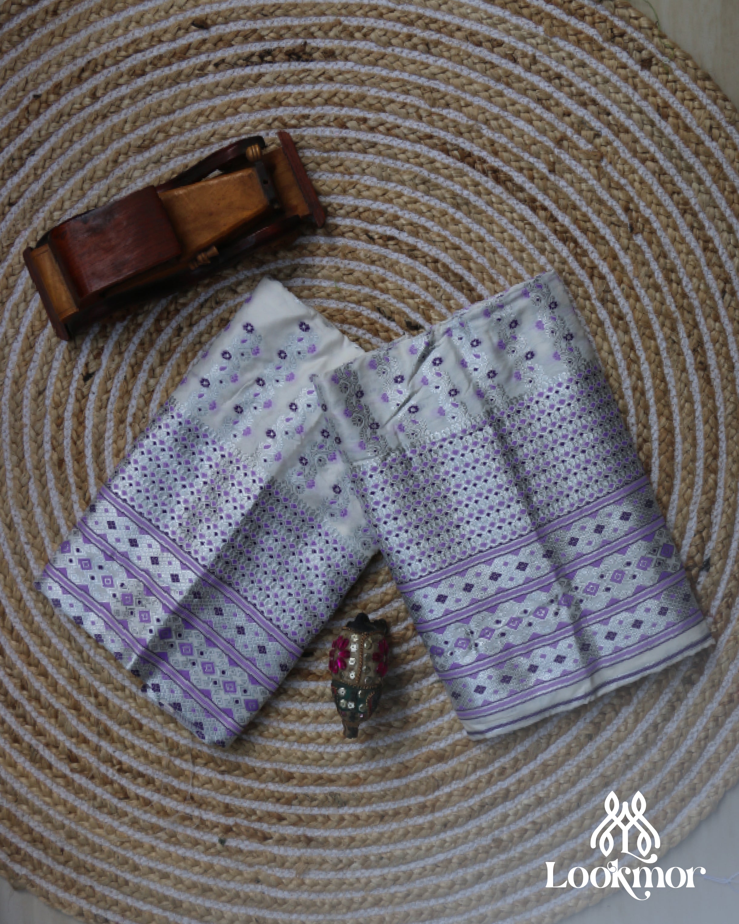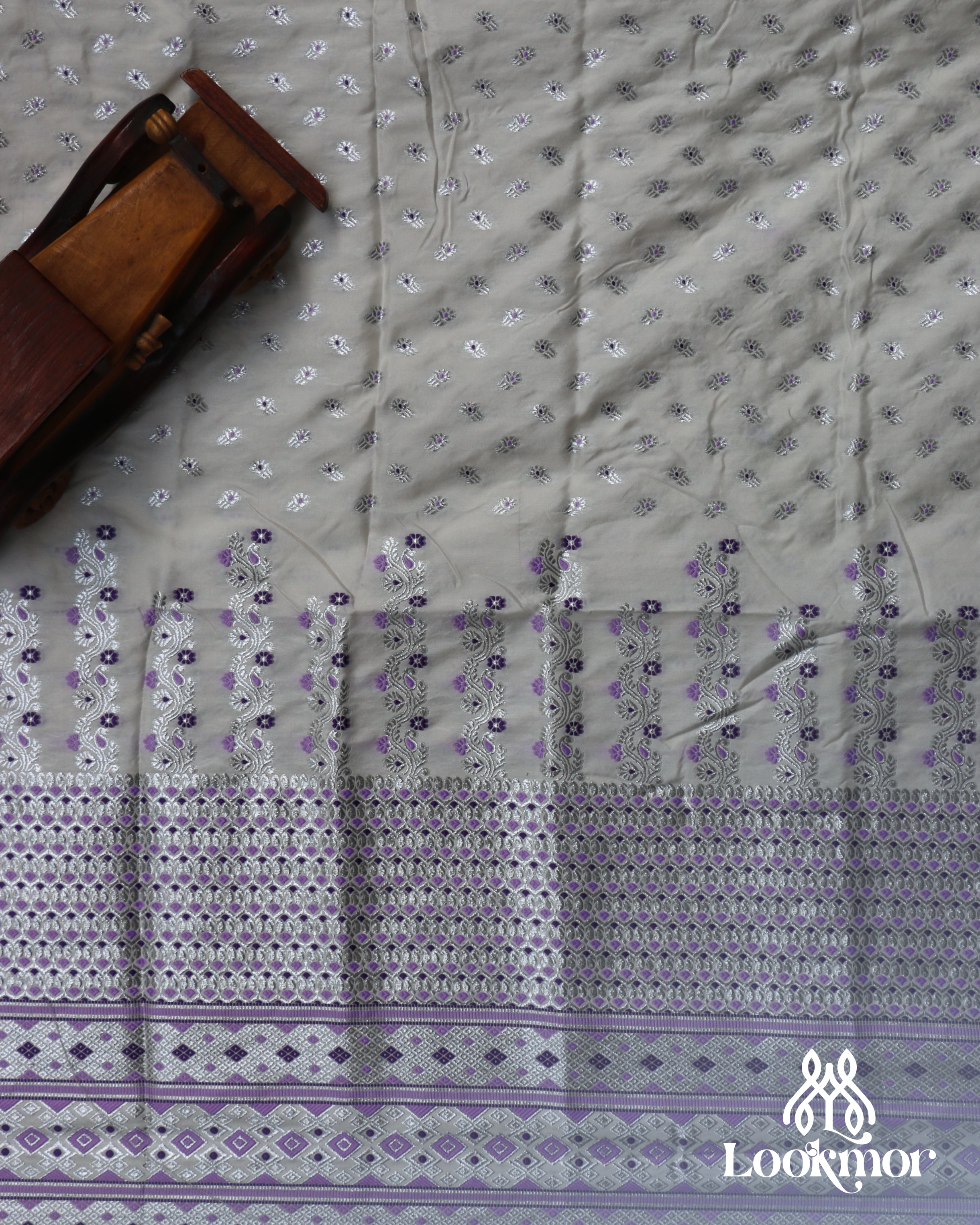 White Silver Jari Premium Semi paat Set Mekhela Sador