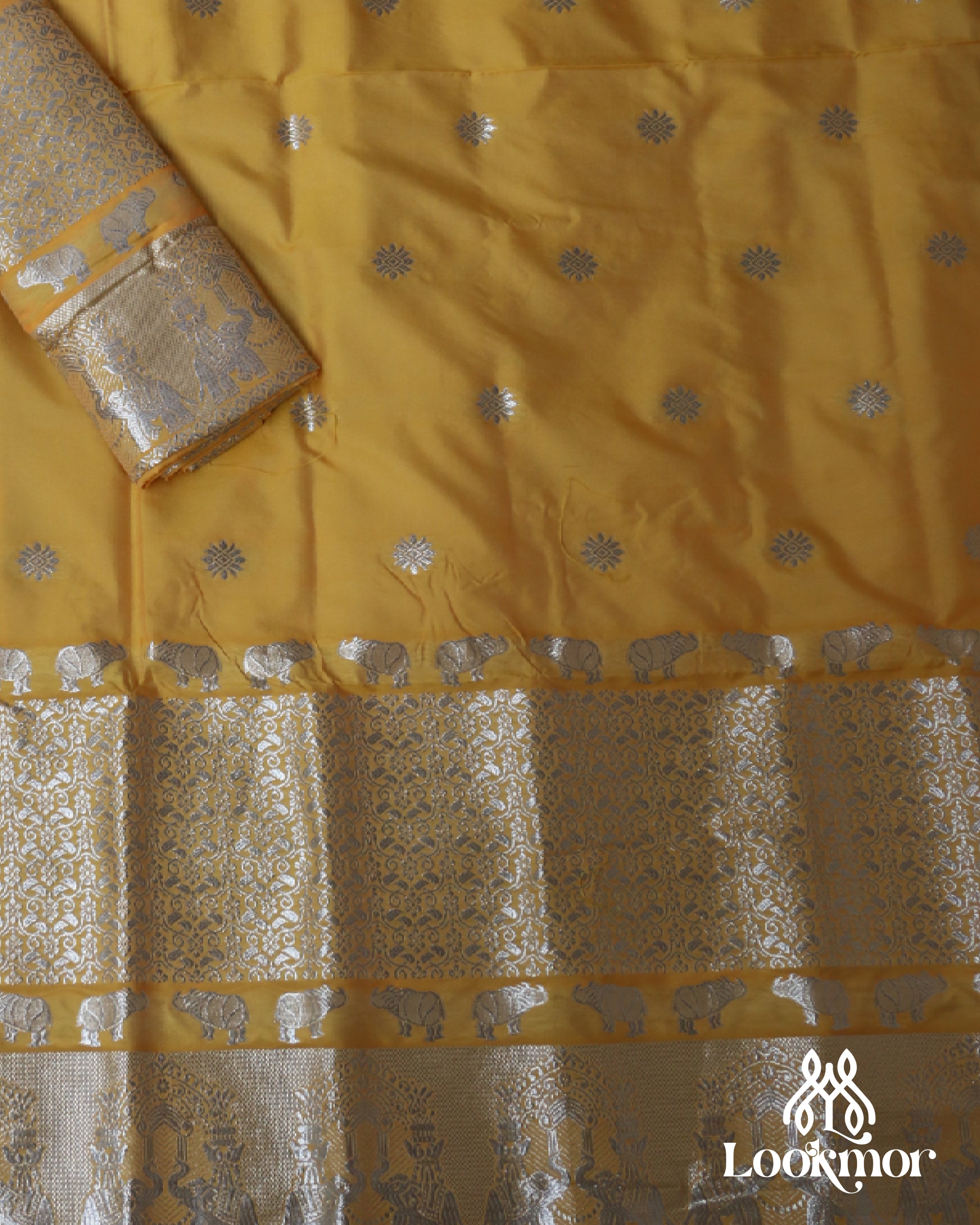 Yellow Silver Jari Super Semi Paat Set Mekhela Sador